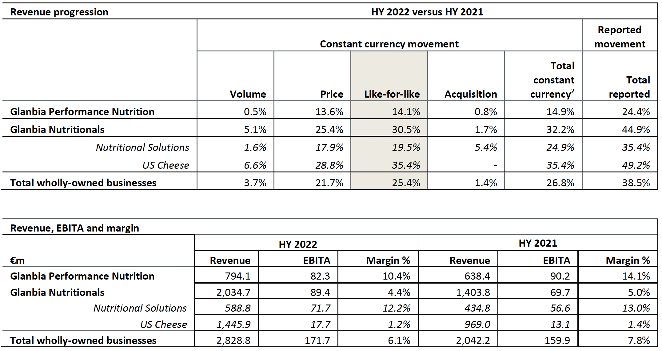 The resilience and momentum of Glanbia’s core brands and nutritional solutions ingredients portfolio in HY 2022 supports the Group’s confidence in its ability to navigate continuing external risks including an increasingly challenging economic environment, the impact of geopolitical tensions, and unprecedented inflation. In the absence of any further unanticipated major market disruption, Glanbia expects sustained revenue and earnings momentum in H2 2022.