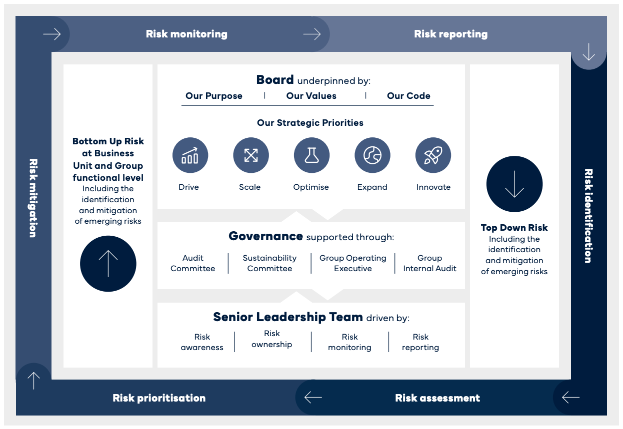 The Group encounters risk every day in the pursuit of its strategic priorities. Our risk management framework is designed to ensure that risk management is embedded into our culture, policies and practices. There is input across all levels of the business to enable the Group to remain responsive to the ever-changing operating environment. An overview of the Group’s risk management and internal control framework is outlined in the diagram below.